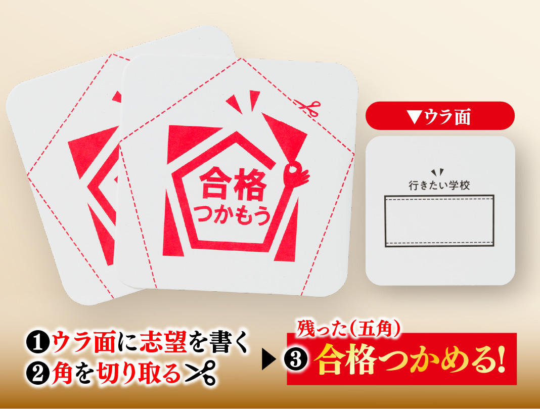 ウラ面の「行きたい学校」に、自分が目指す学校を書きます。裏面の切り取り線に沿って切り取ることで合格(五角)をつかむことができます。切り取ったものは、お守りとしてご利用ください。