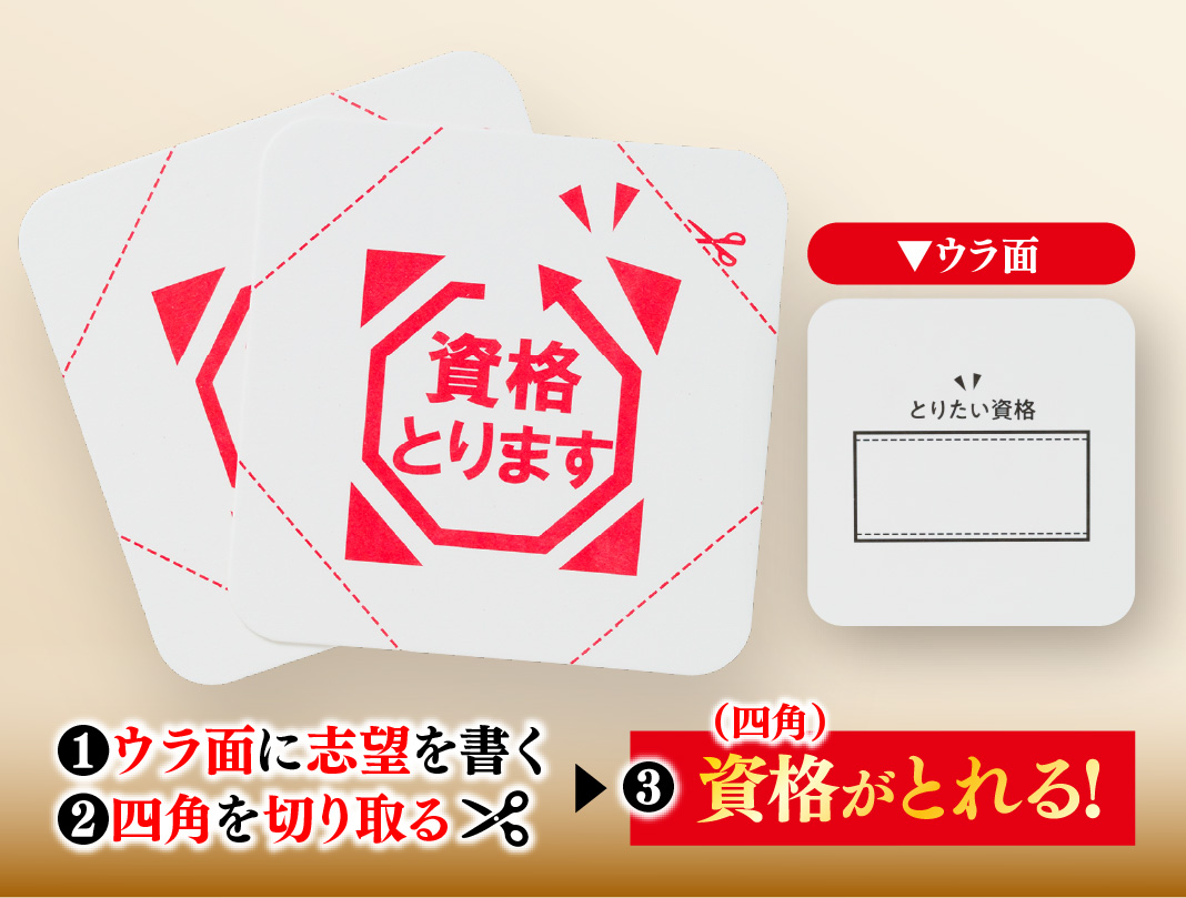 ウラ面の「取りたい資格」に、自分が目指す資格を書きます。裏面の切り取り線に沿って切り取ることで資格(四角)を取ることができます。切り取ったものは、お守りとしてご利用ください。