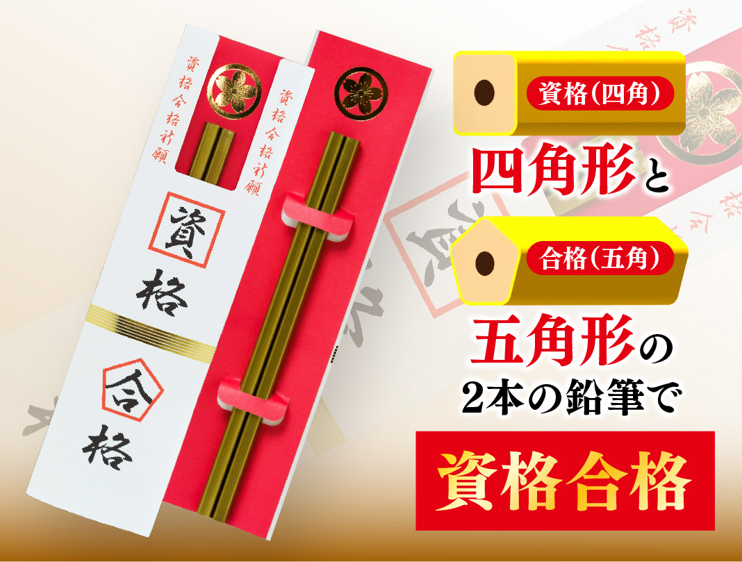 資格試験合格への道を照らす「資格合格鉛筆」四角形と五角形の2本の鉛筆は、四角形に「資格」、五角形に「合格」の願いが込められています。資格試験勉強に取り組む方への心強いエールとして、ぜひお贈りください。